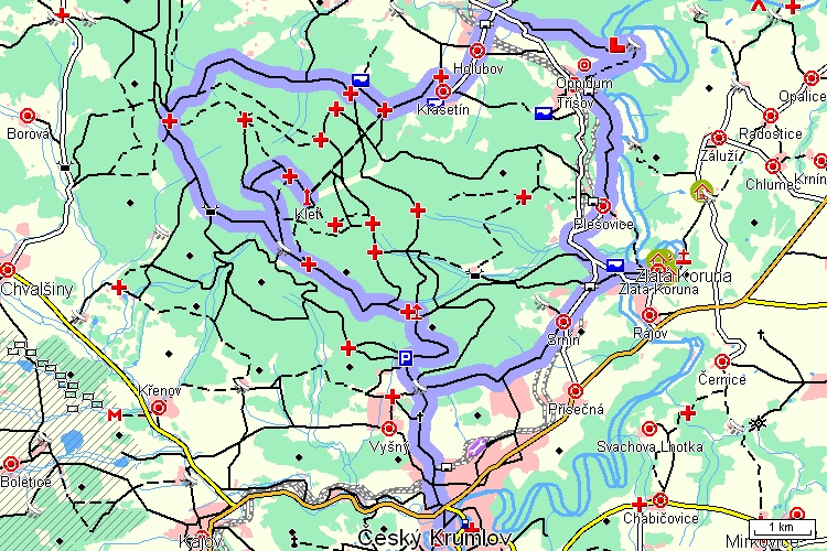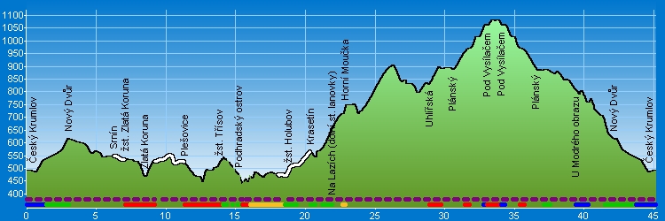 Český Krumlov | Nový Dvůr | Srnín | žst. Zlatá Koruna | Zlatá Koruna | Plešovice | žst. Třísov | Podhradský ostrov | Dívčí Kámen | žst. Holubov | Holubov | Krasetín | Krasetín | Na Lazích (dolní st. lanovky) | Horní Moučka | Uhlířská | Plánský | Pod Vysílačem | Kleť | Pod Vysílačem | Plánský | U Hájovny Plánský | U Modrého obrazu | Nový Dvůr | Český Krumlov